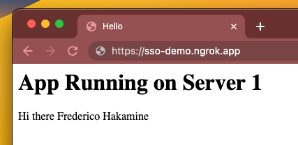 But if you take a look at the sample app code (ngrok-tutorial/lesson1/app.js, lines 9-13), you will notice that my app is ready to receive a user name (in the name variable) and provide a warm greet whenever my app is served by ngrok with authentication at the edge: