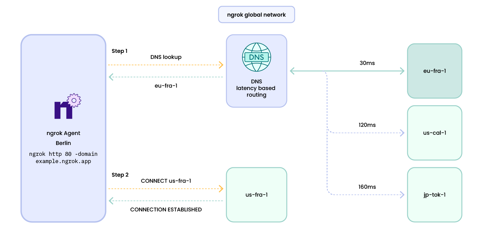 In the graphic below, the API consumer is located in Berlin, so ngrok would route traffic first to its Europe-based PoP eu-fra-1, then onto your Droplet based in Berlin.