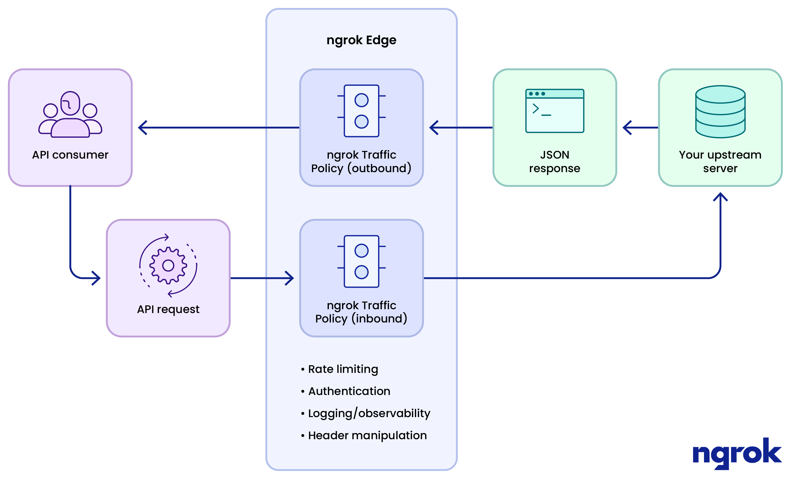 At the heart of this flexibility is our new Traffic Policy module, which provides a flexible, programmable, and uniform approach to managing API requests and responses across all the ways you use ngrok. This module lets you securely connect your APIs, whether they’re in local testing environments or production deployments, using a single configuration, with support for essential security and availability policies like JWT authentication and rate limiting.