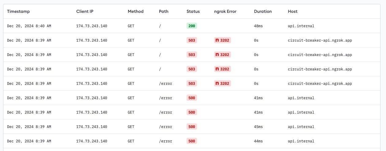 When you use ngrok as your API gateway, you can also use Traffic Inspector to view every request and response sent to your upstream services. That includes seeing the entire lifecycle of your circuit breaker action, including which requests triggered error codes from your upstream service, which requests were blocked by the tripped breaker (with the associated ngrok error 3202), and when they started to flow normally again.