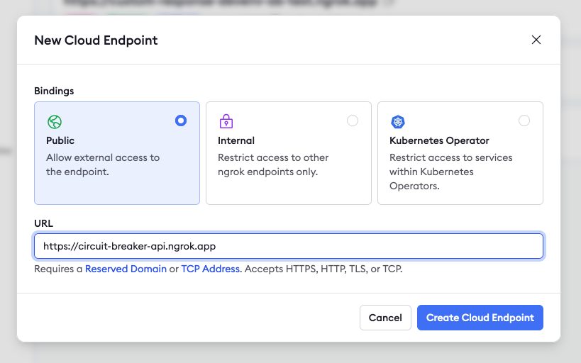 In the ngrok dashboard, reserve a domain and head over to the Endpoints section of the ngrok dashboard and to create a new cloud endpoint. Leave the binding as Public and enter your reserved domain as the URL.