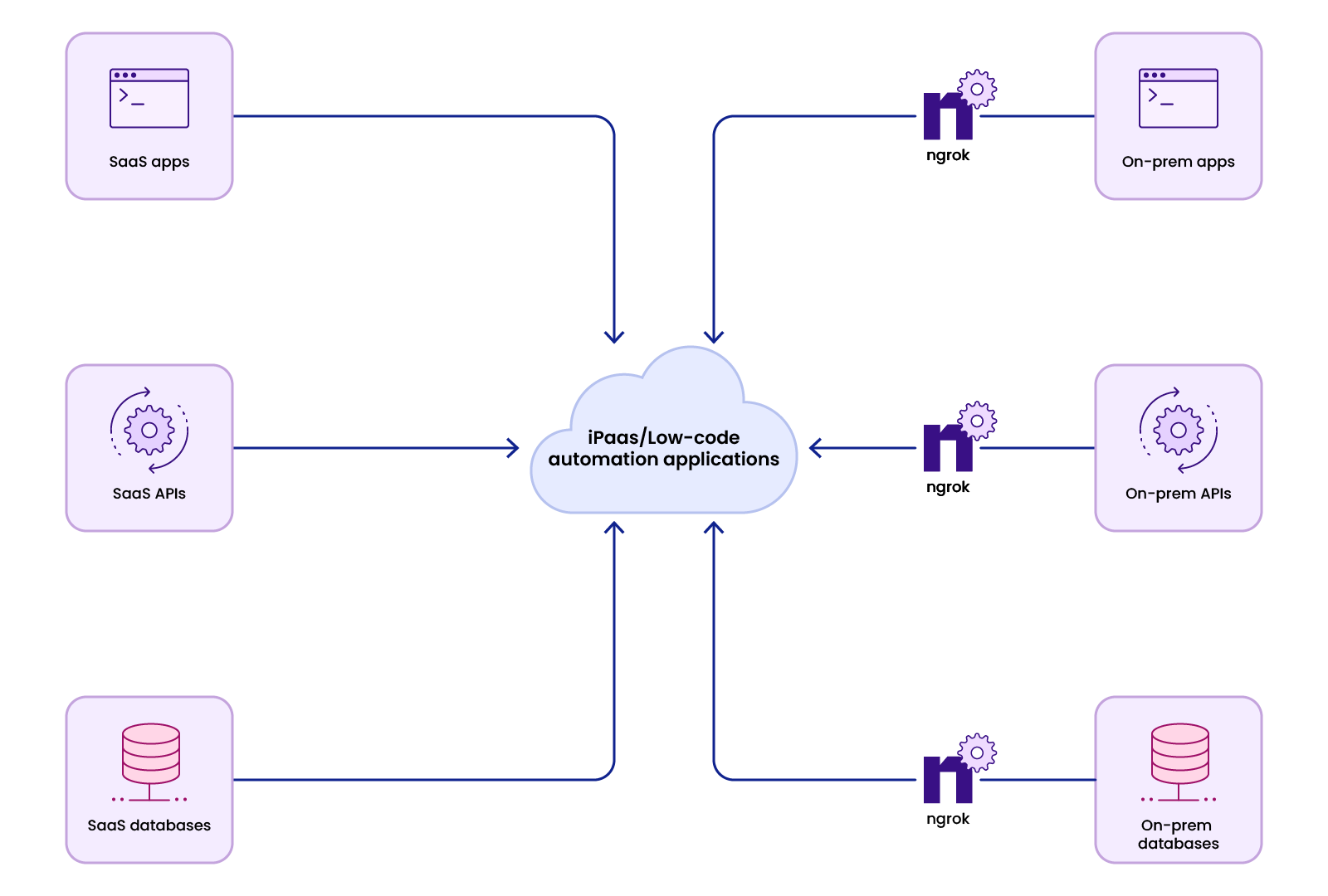 Many iPaaS vendors and low-code automation solutions already require customers to run a custom script in their network to facilitate integrations. With ngrok, you can integrate connectivity directly into your applications using ngrok's SDKs and avoid running a separate ngrok agent.
