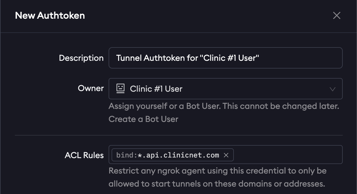 https://api.ngrok.com/bot_usersNavigate to the ngrok dashboard under *Authtokens` and create an authtoken for that bot user and assign it an ACL Binding, so that it can only create endpoints bound to the reserved wildcard domain for that clinic’s rest api.