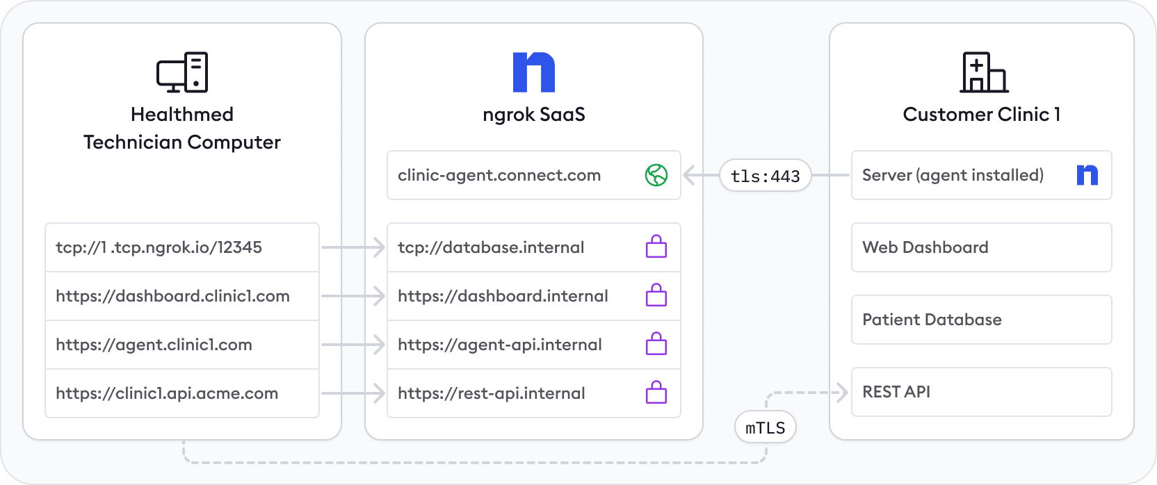 Traditionally, you might assume that every device inside the clinic needs its own ngrok agent, but this is unnecessary. A single ngrok agent is installed on a network-accessible server inside the clinic, and it: