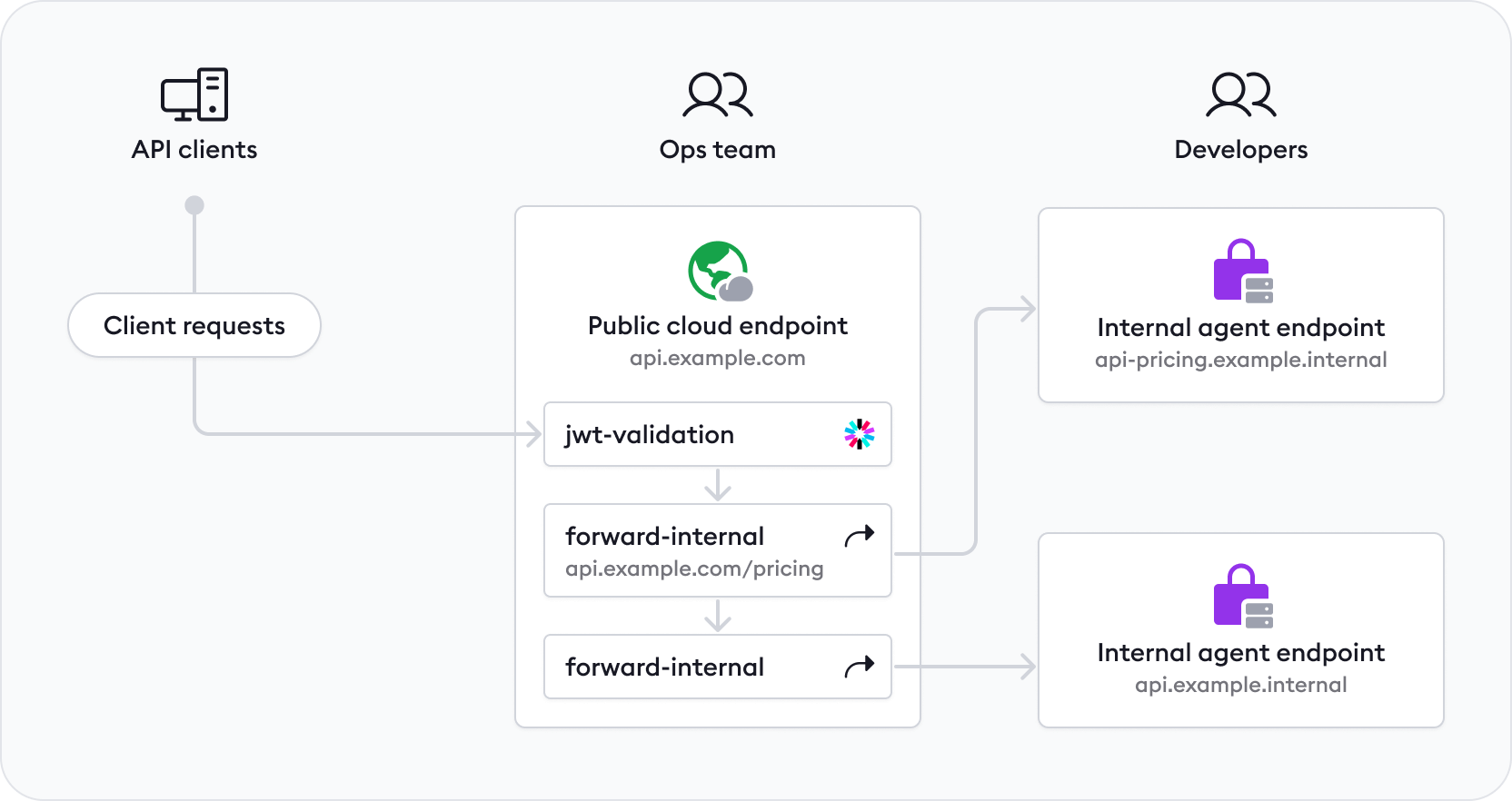 When ready, Ops can enable public API access via api.example.com/pricing and route to api-pricing.example.internal using the forward-internal action.