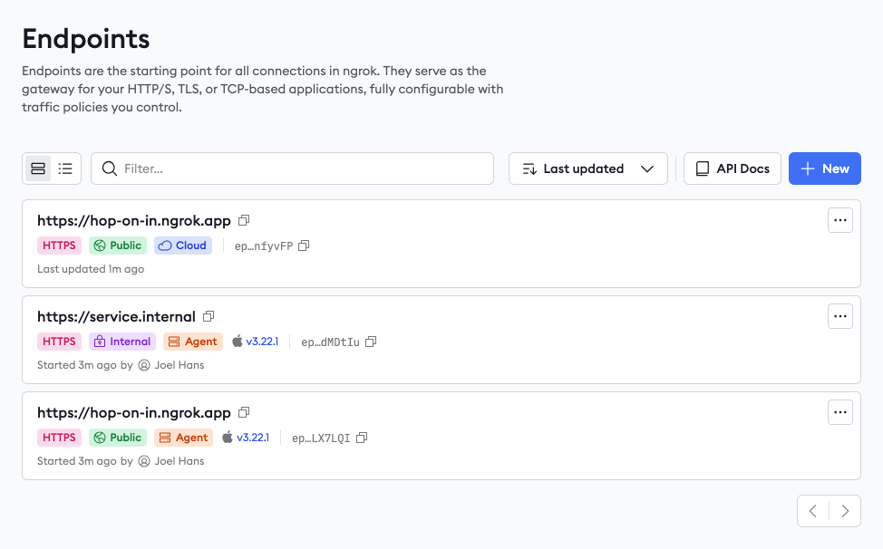 ngrok http $PORT --url https://service.internalNext, jump over to the Endpoints section of your ngrok dashboard, click + New Endpoint, click Cloud Endpoint and select the same URL as your agent endpoint, click Enable pooling, and then click Create Cloud Endpoint. In the Traffic Policy editor, select everything and replace it with: