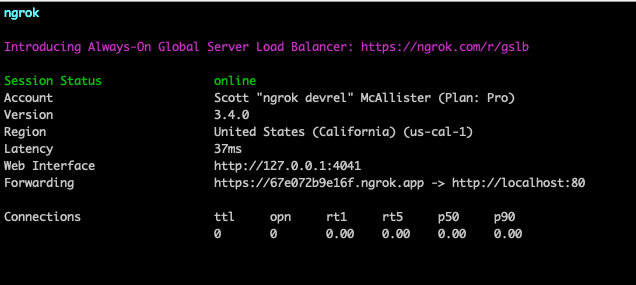 Now, all traffic sent to https://67e072b9e16f.ngrok.app is passing through the ngrok infrastructure which will take care of all the necessary DNS entries, TLS certificates, load balancing, DDoS protection, and everything else needed to create the connection and securely route traffic to port 80 on my machine.