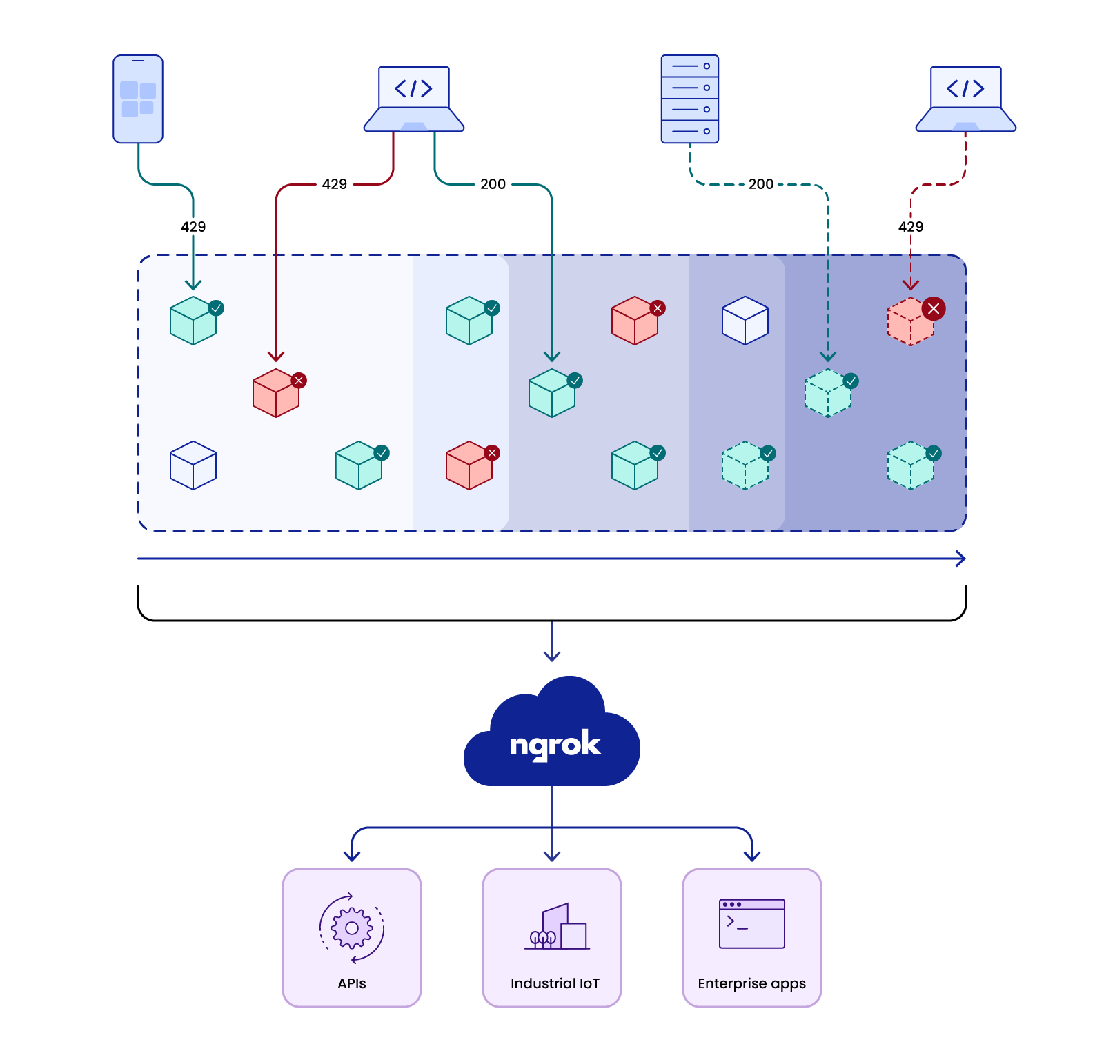 You can now apply rate limits with our Traffic Policy module. With our global rate limiter, when you host your service with ngrok, you get globally distributed traffic management while retaining the ability to control the total rate of requests to your software.