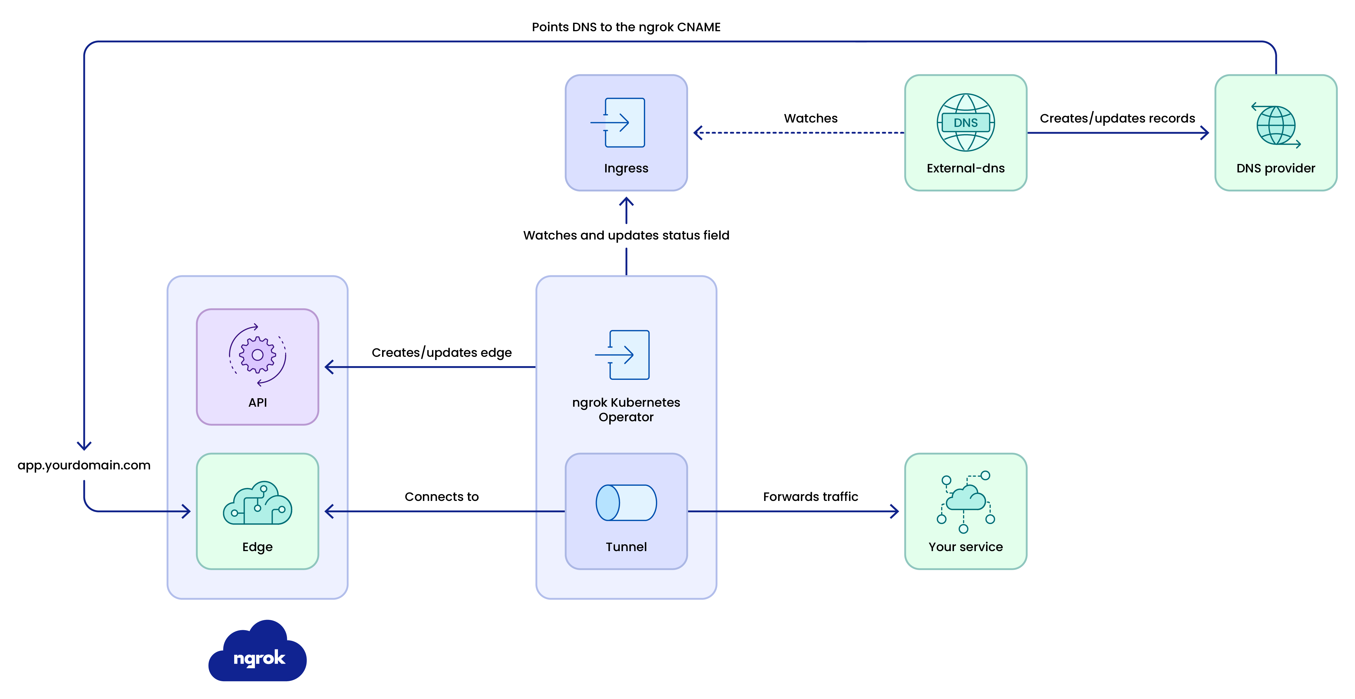 loadbalancer.ingress.hostname or loadbalancer.ingress.ip.The ngrok Kubernetes Operator collapses these steps into a simpler ingress configuration. You don’t need to install and manage cert-manager, as certificates are automatically provisioned and managed by ngrok. If you only use ngrok subdomains or manage DNS manually, you don’t need to install and configure ExternalDNS. If you are using your own subdomain with ngrok (app.yourdomain.com, for example), you can continue to use ExternalDNS to automatically create CNAME records pointing to ngrok for ingresses created by the ngrok Kubernetes Operator. This diagram below shows how the operator automates edge provisioning in the ngrok API and forwards traffic from ngrok’s edge network to your service in Kubernetes.