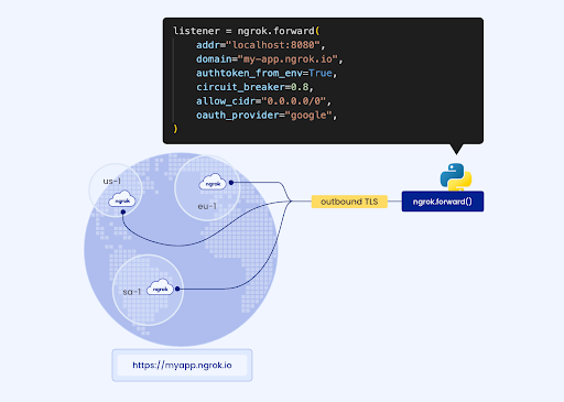 server.serve_forever()Similar to how the other ngrok SDKs work, such as ngrok-go, in the example above, when calling ngrok.forward() ngrok-python creates a secure and persistent outbound TLS connection to ngrok’s ingress-as-a-service platform.