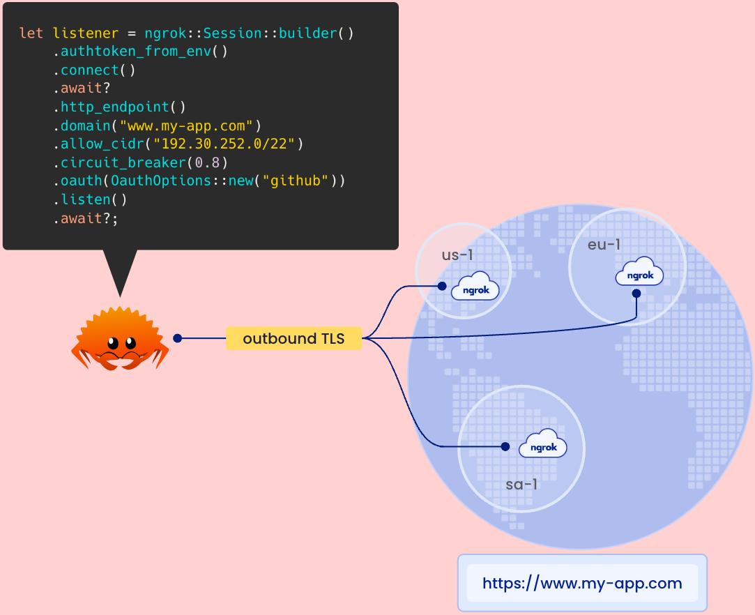 When you create the listener object, ngrok-rs initiates a secure and persistent outbound TLS connection to ngrok’s ingress-as-a-service platform and transmits your configuration requirements — i.e. domain, authentication, webhook verification, and IP restrictions.