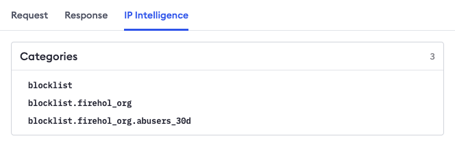 - type: denyOr, you might want to get more nuanced by looking at the logs of Traffic Inspector. If a request hits your endpoint from an IP address that's on a blocklist we've added to IP Intelligence, we flag it with a small inline warning symbol. If you click on the request, then the IP Intelligence tab, you can find more information on the attached categories.