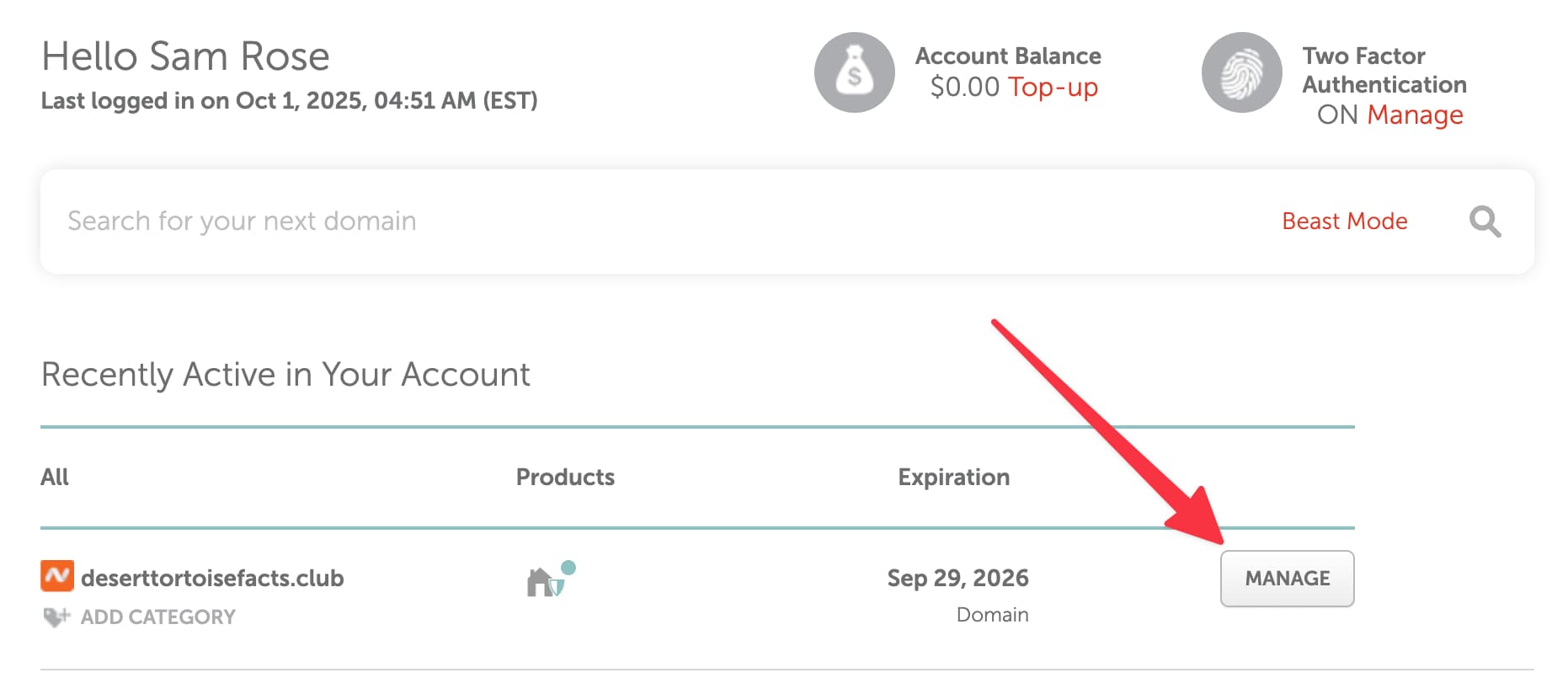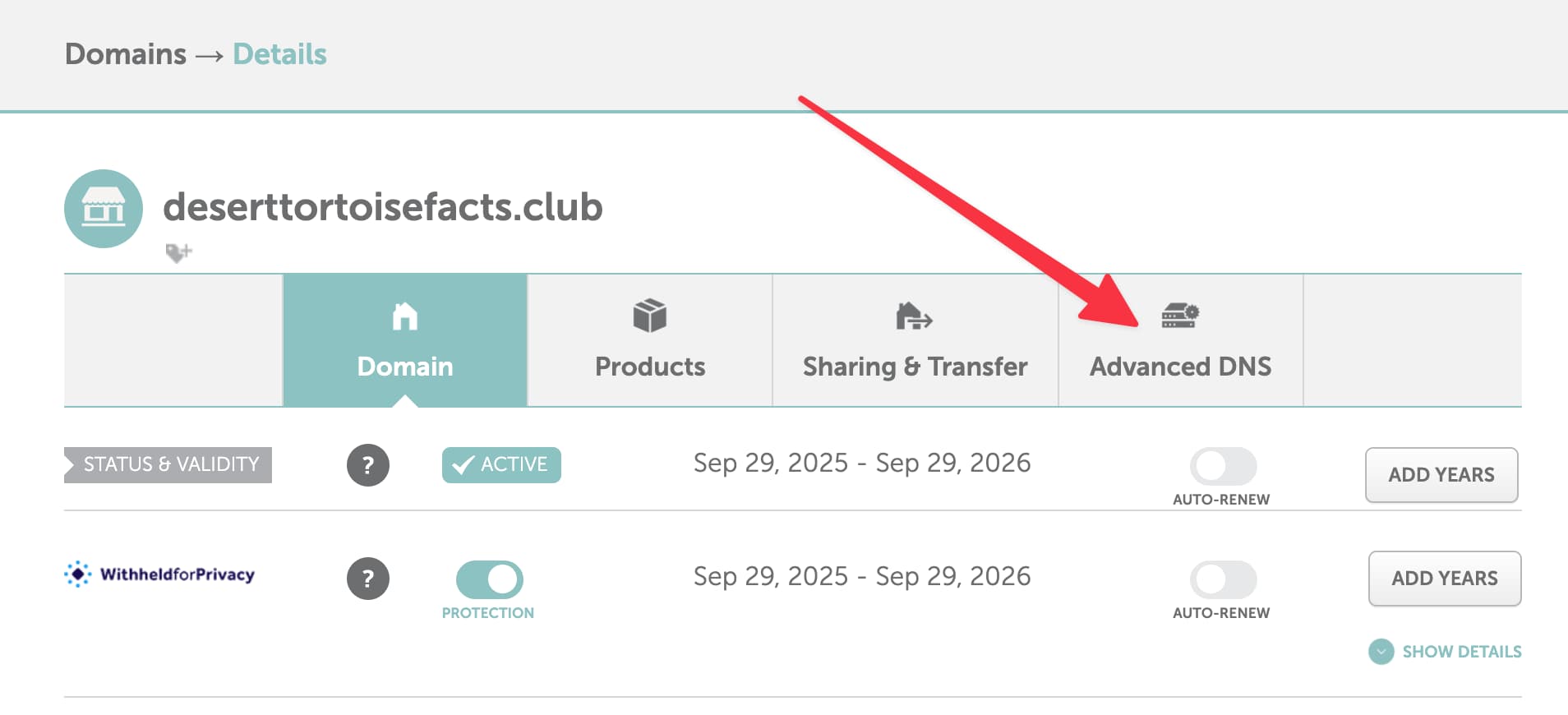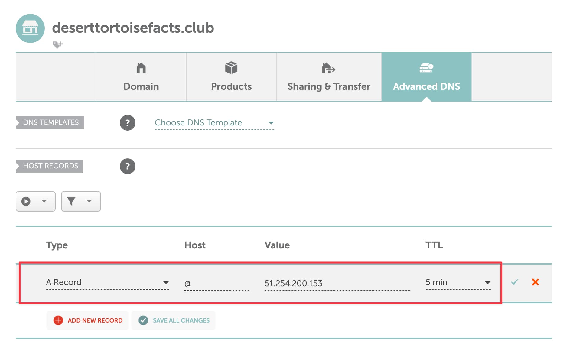 The last thing I need to do in my domain registrar is configure deserttortoisefact.club to point to my VPSs IP address, 51.254.200.153.