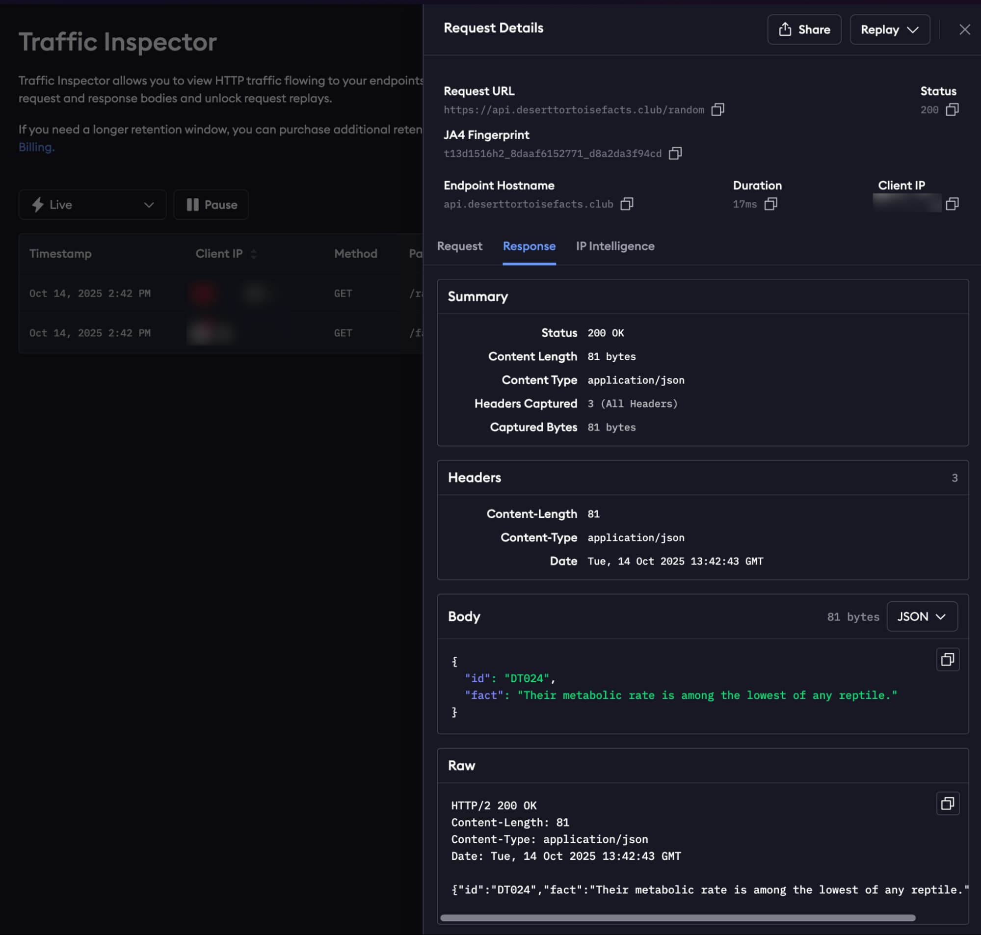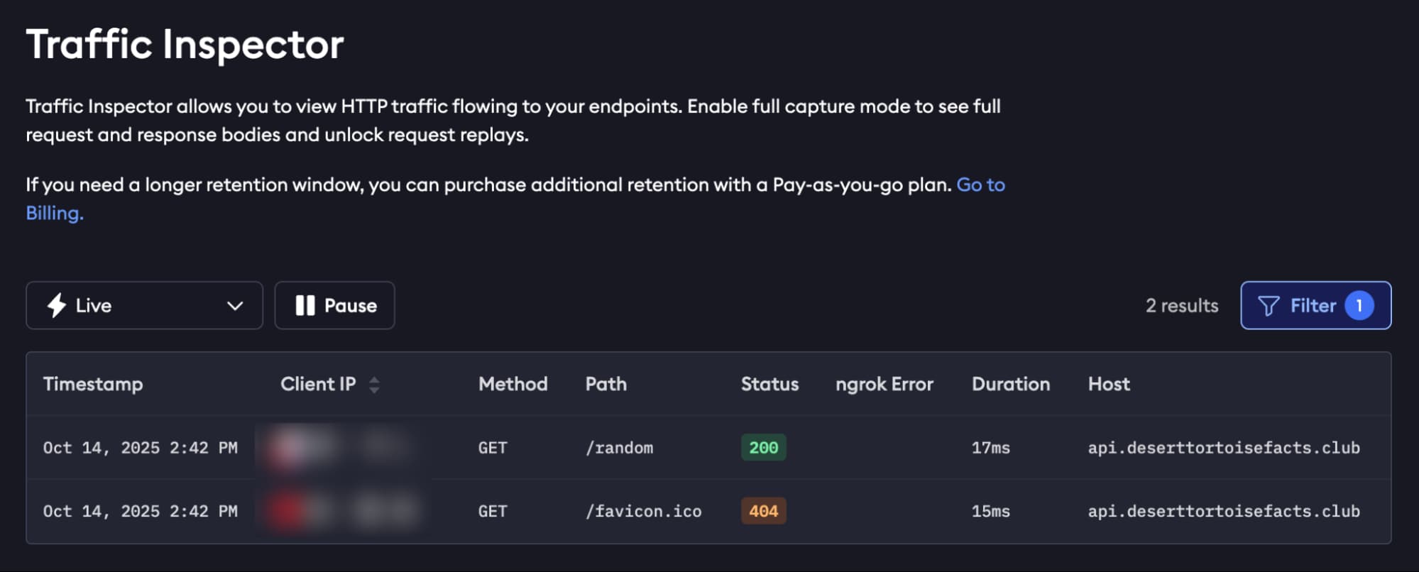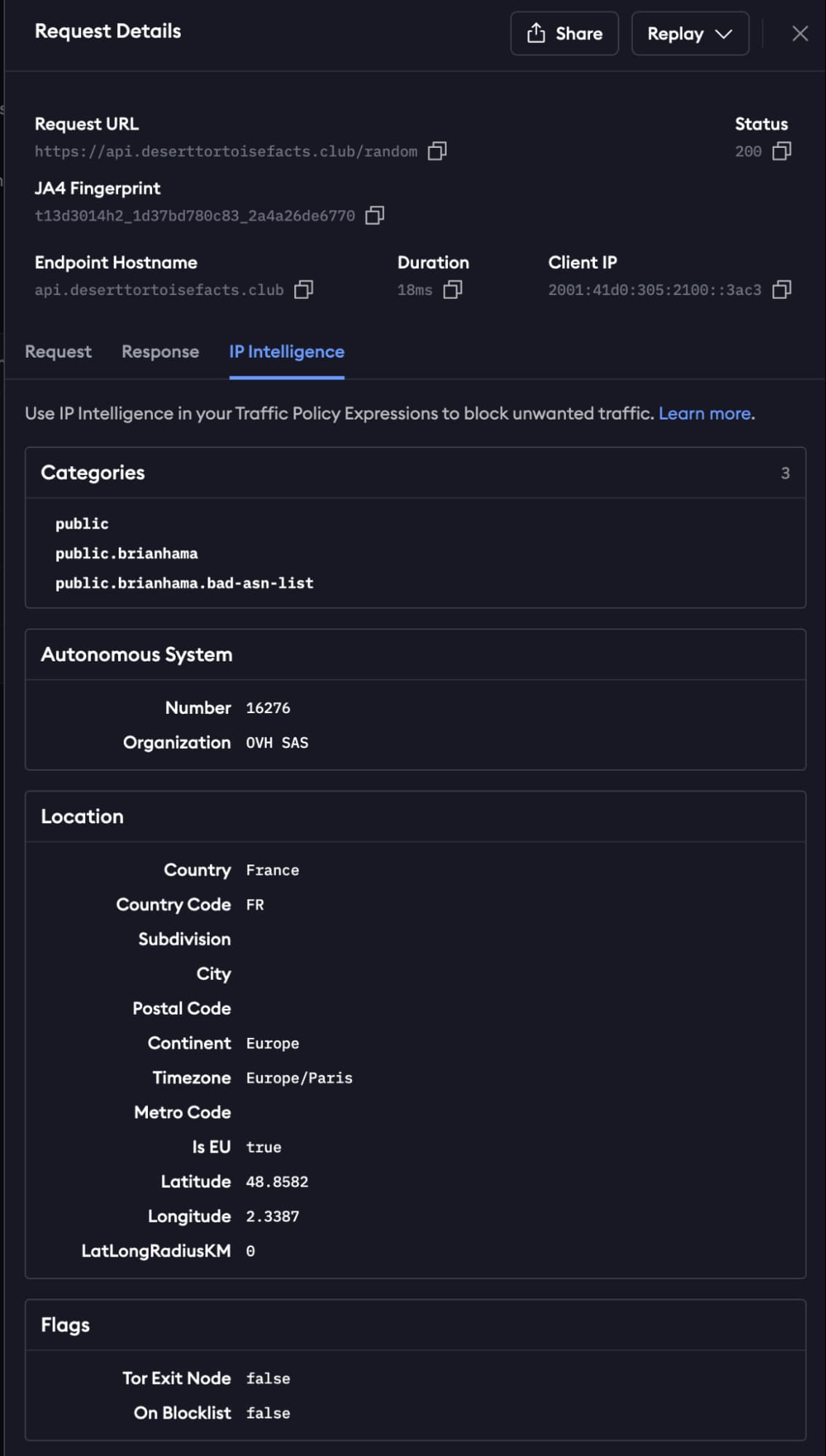 Attached to every request that comes in to ngrok is a suite of information based on the IP address of the client. If I make a curl https://api.deserttortoisefacts.club/random request from my VPS, here's what I see in the IP Intelligence section of the request in Traffic Inspector: