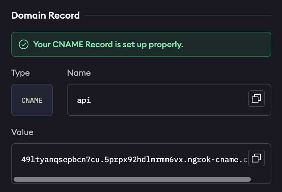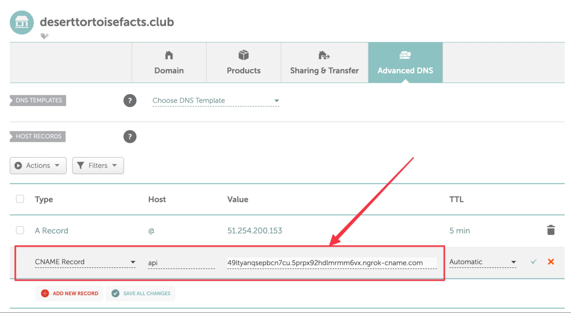 At time of writing, ngrok does not currently support “apex domains.” deserttortoisefacts.club is an apex domain, which just means that it only has a single dot in it. In order to use ngrok, we need to create a “CNAME” record, which can only be created for domains with 2 or more dots in them.