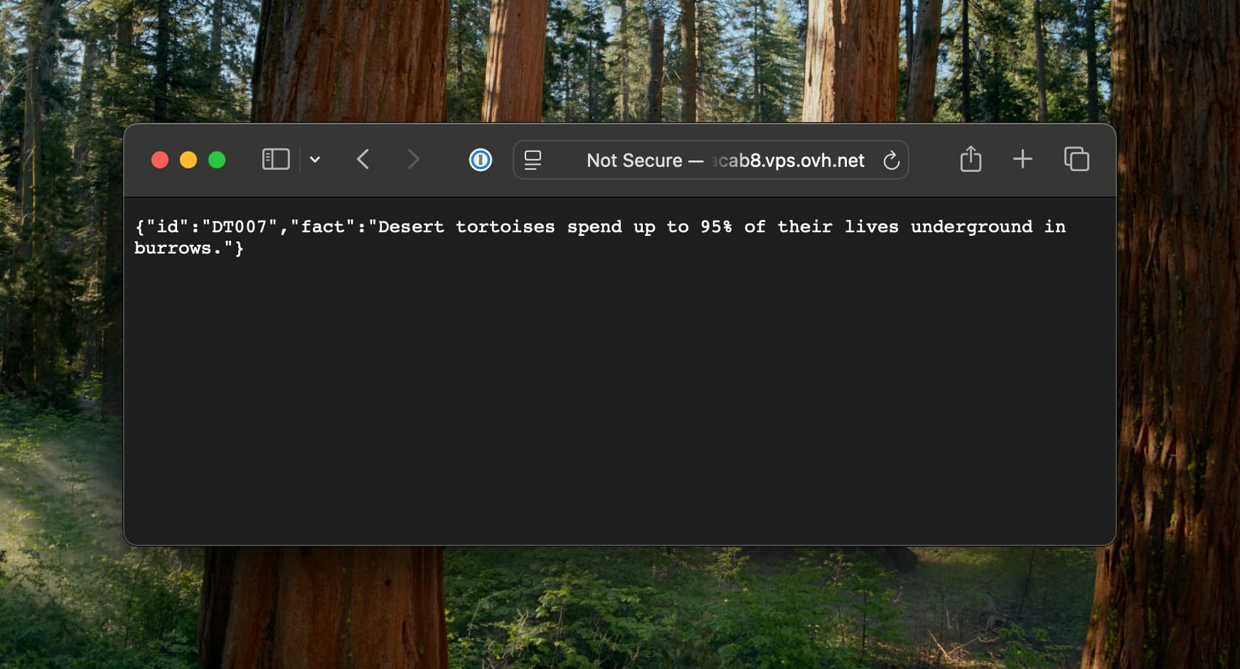 API is running on http://localhost:5000And now I can access https://vps-4f0acab8.vps.ovh.net:5000/random in my browser to get a random desert tortoise fact.