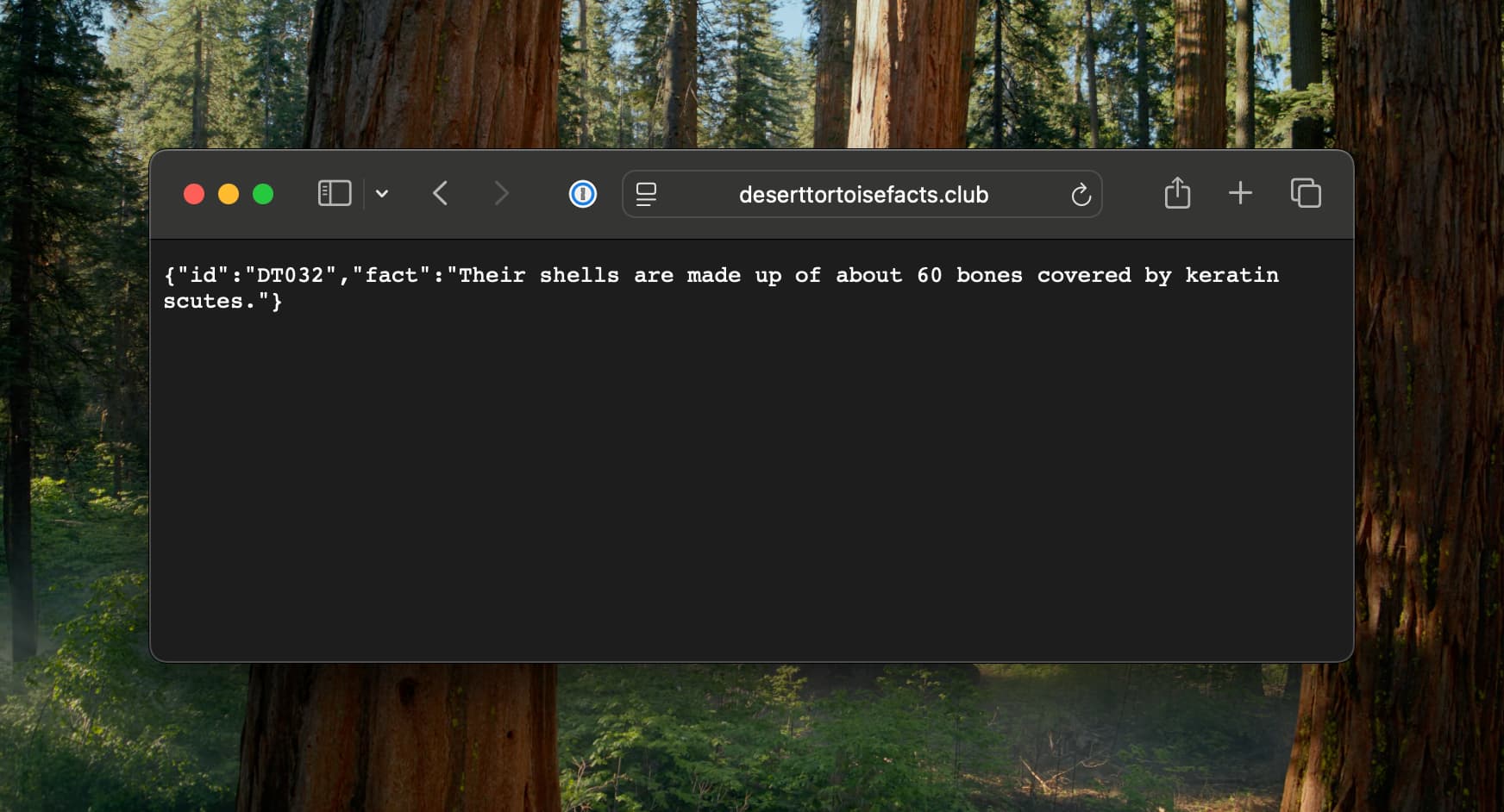 ...[snip]...And now I can visit https://api.deserttortoisefacts.club/random and get a fact!