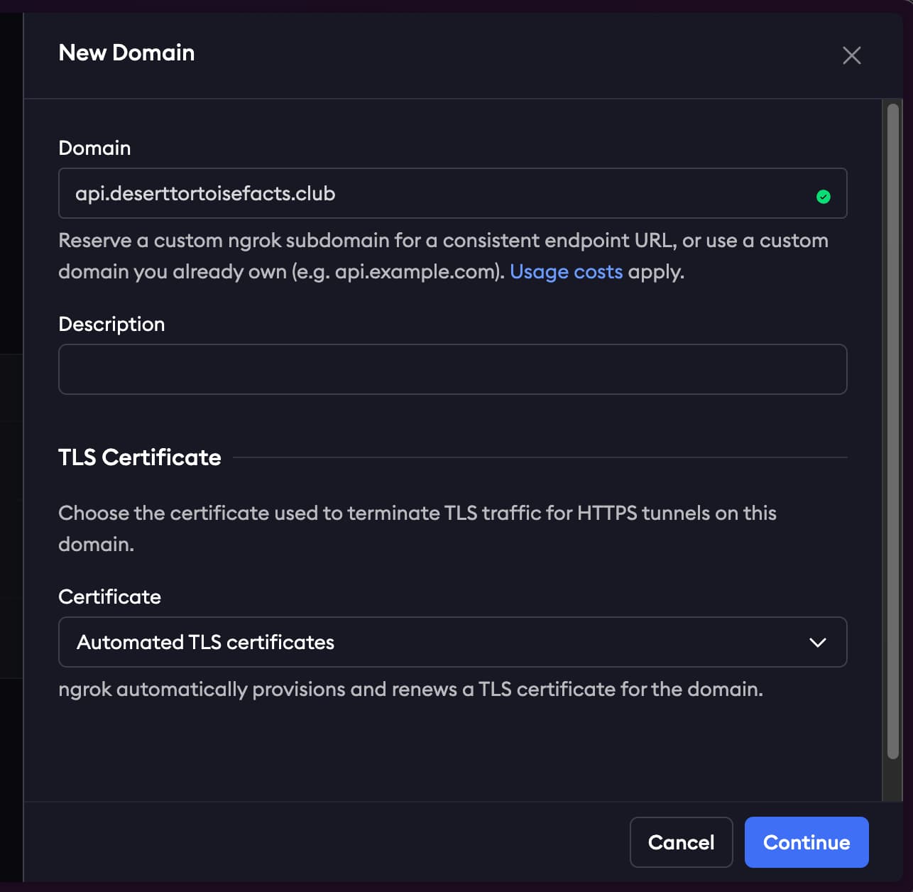 Next I need to run ngrok on my VPS and configure it to route traffic from api.deserttortoisefacts.club to port 8080. I follow the setup instructions at in the dashboard to install ngrok, then create a configuration file defining my endpoint.
