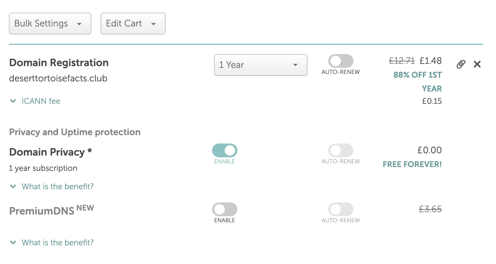 Domain registrars tend to have lots of extra services they provide, like email and web hosting, but I just need the domain name so I went through the checkout process with the defaults and nothing extra.