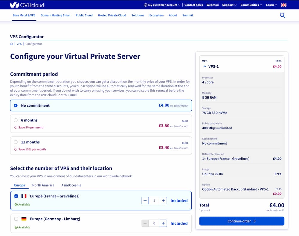 I chose OVHCloud's VPS-1 plan, and I went with one of their France regions because it's close to me. You'll want to start off in a region you think is going to be closest to your users, because latency is higher the further away they are. Higher latency, longer page loads.