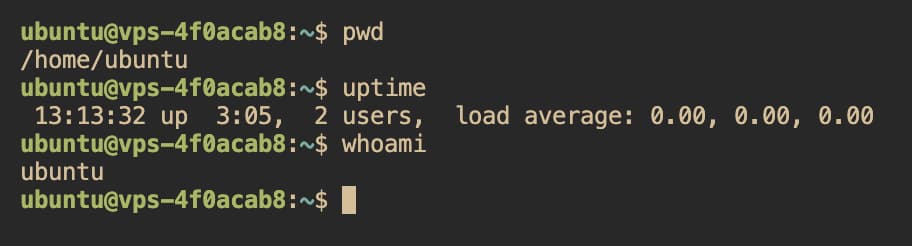 mainFrom now on, any prompt that starts with ubuntu@vps-4f0acab8:~$ is going to represent the VPS, and ones that start with just $ will be my laptop.