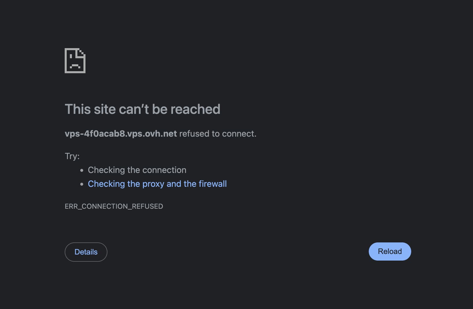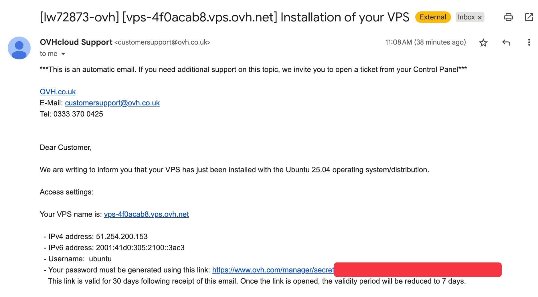 The important details here are that I can access my our VPS can be accessed at vps-4f0acab8.vps.ovh.net, and it has an IPv4 address of 51.254.200.153. I'll need this later.