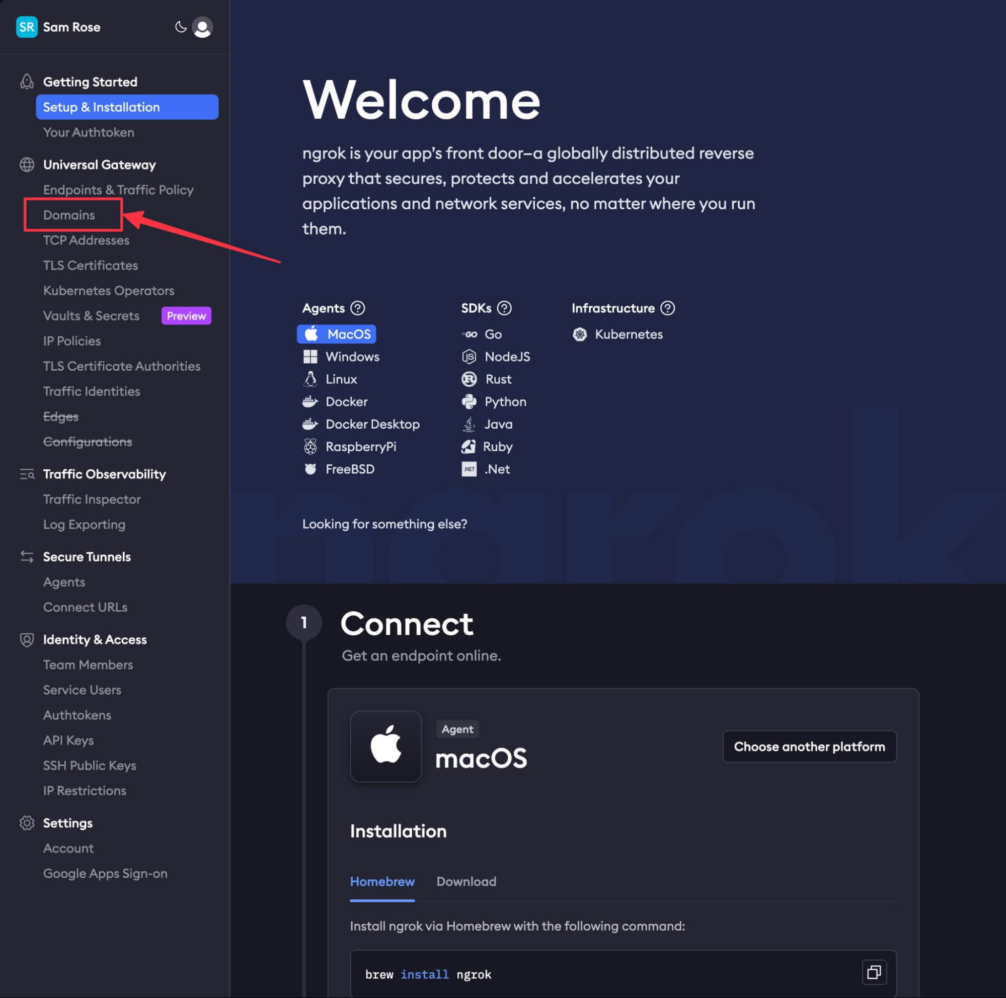 If you haven't already, you'll need to create an account at https://ngrok.com. After doing so, you'll be dropped into a dashboard that looks like this.