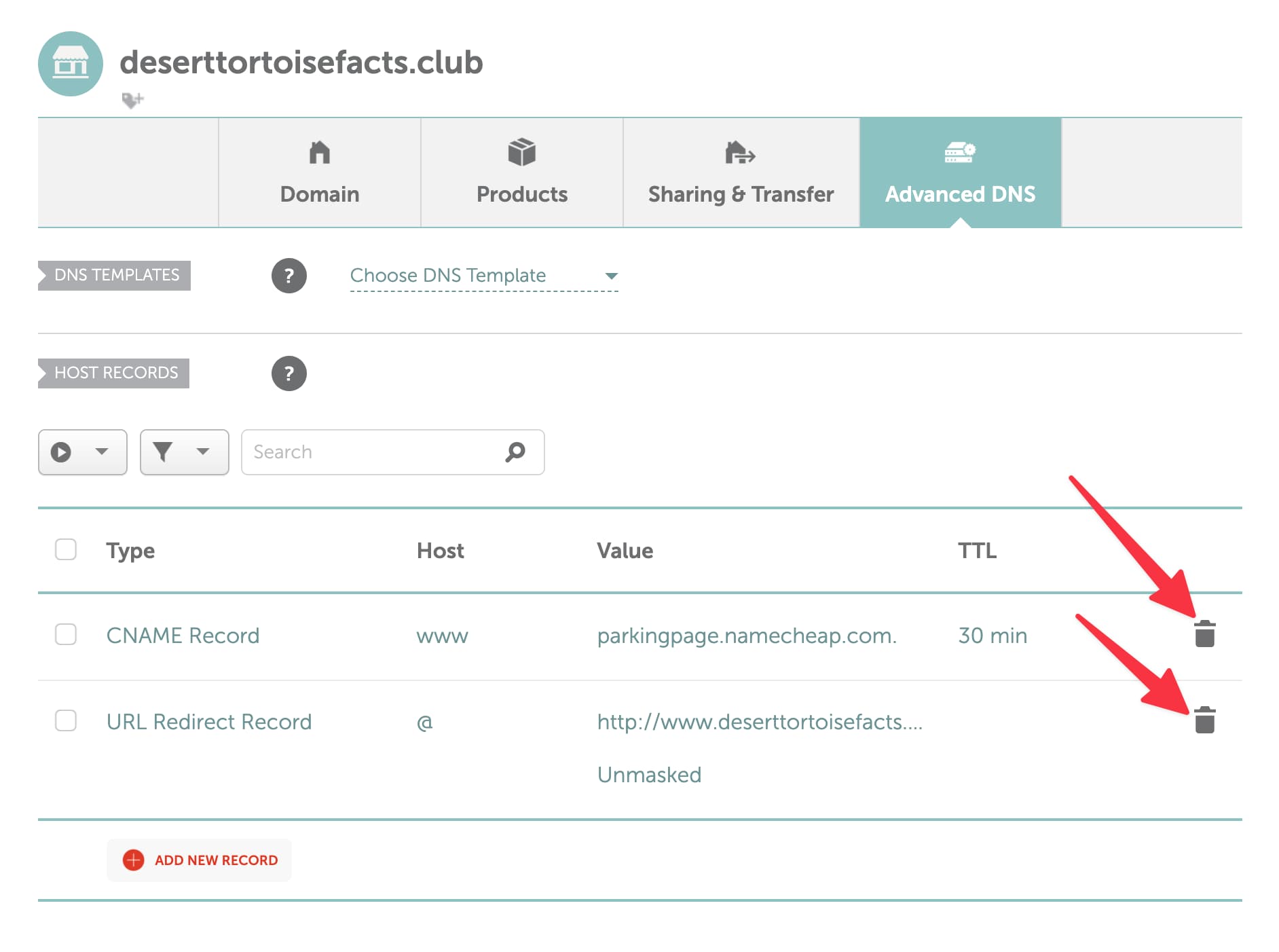 Now I need to go over to https://namecheap.com and create a DNS record as shown above.