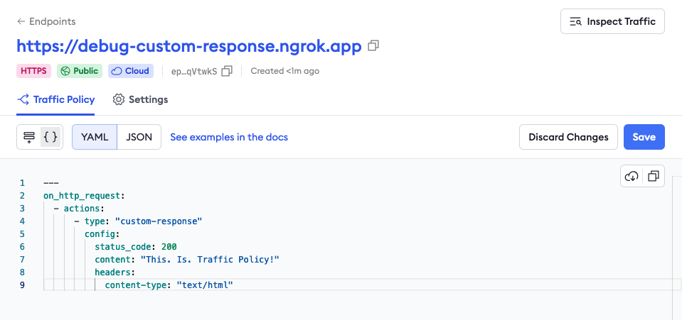 content-type: "text/html"As we wrote more Traffic Policy rules to show prospective customers or publish on this very blog, like advanced routing topologies or tweaking headers in every way imaginable, we realized the custom-response action was also a fantastic shortcut. Because of the terminal quality of the action, you can make it act like a very simple upstream service. That allows you to develop and test Traffic Policy rules without first standing up an upstream service, an ngrok agent, and a public endpoint.