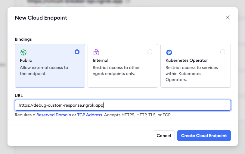 Head over to the Endpoints section of your ngrok dashboard, then click + New and New Cloud Endpoint. Leave the binding as Public, then enter your reserved domain name.