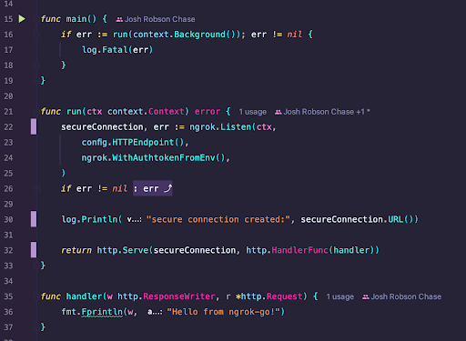 ngrok-go offers a comprehensive solution to these challenges, making application deployment and management smoother than ever. Let’s take a look at the code. The following is a simple web application, including all the code needed to embed the ngrok Go SDK.