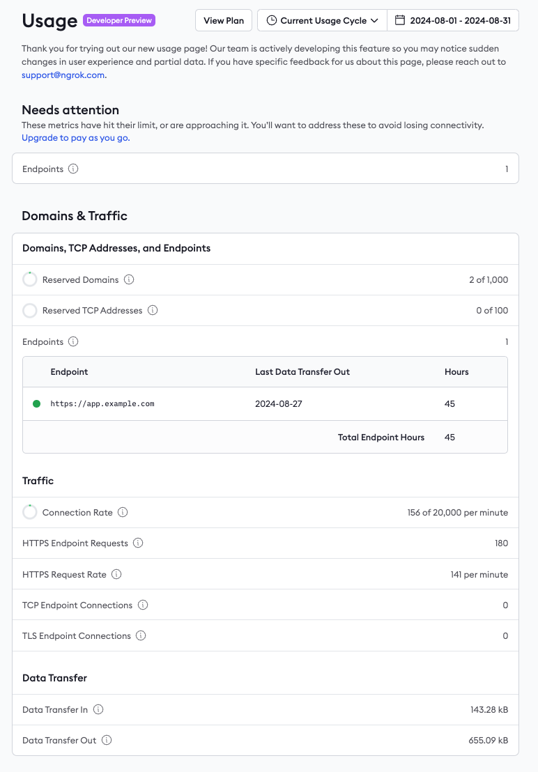Since introducing usage-based plans and pricing, ngrok has been gathering feedback and striving to provide greater transparency about endpoint traffic to our users. We're thrilled to announce the launch of an updated usage view for your ngrok account. This new feature allows you to quickly assess your account's traffic volume and identify areas where you may be approaching or exceeding your account limits.