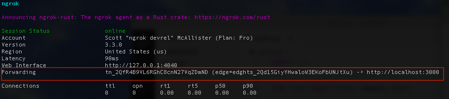 ngrok tunnel --label edge=edghts_2Qd15Gn0tReDacT3DKoFbUNJtXu http://localhost:3000The output for the tunnel command will look similar to the regular `ngrok http` display, with one major difference on the `Forwarding` line. There you’ll see something like:
