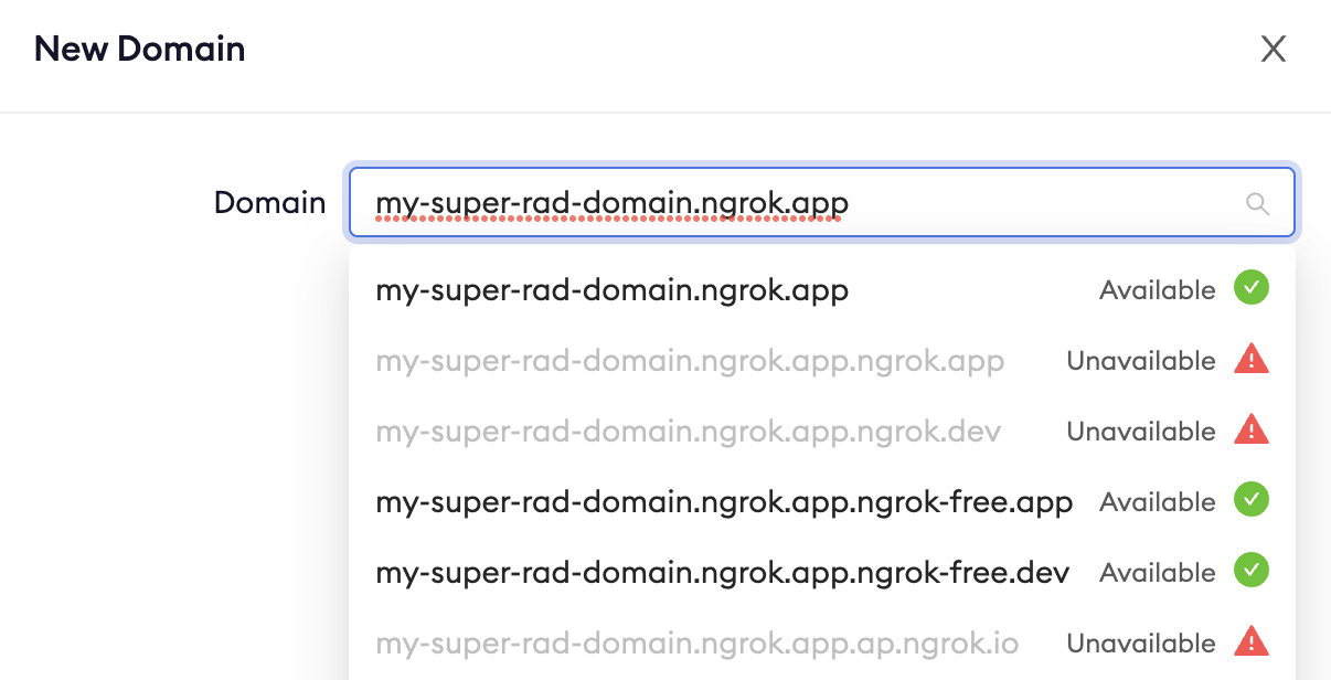 To connect your domain go to the Domains section of the Cloud Edge menu and click on the New Domain button. Type the domain you’ve been using with your webhook. Since the domain you used before worked with ngrok in the command line, the domain should still be available. In my case `my-super-rad-domain.ngrok.app` was available! So, it won’t be for you. Feel free to choose an equally awesome domain name for your Edge.