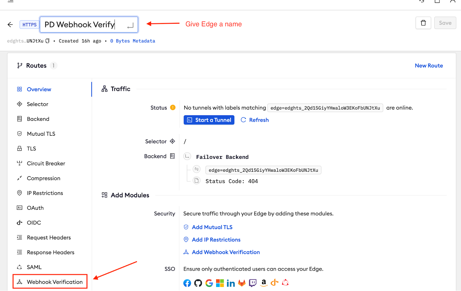 The default HTTPS Edge gives us an Endpoint with a unique URL and the option to configure a variety of modules. First, give the Edge a name, so you can find it later. In this case, I’ll use, “PD Webhook Verify.”