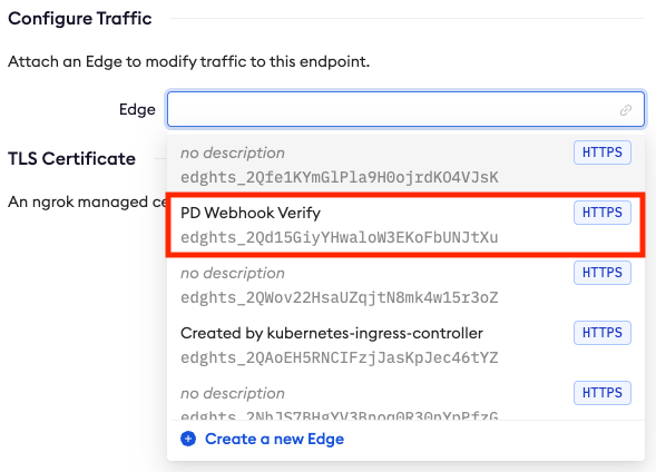 With your Domain selected you will then choose to attach it to your Edge. Remember, ours is called, “PD Webhook Verify.” Notice how easy it is to find your Edge when you give it a good name, as seen below.