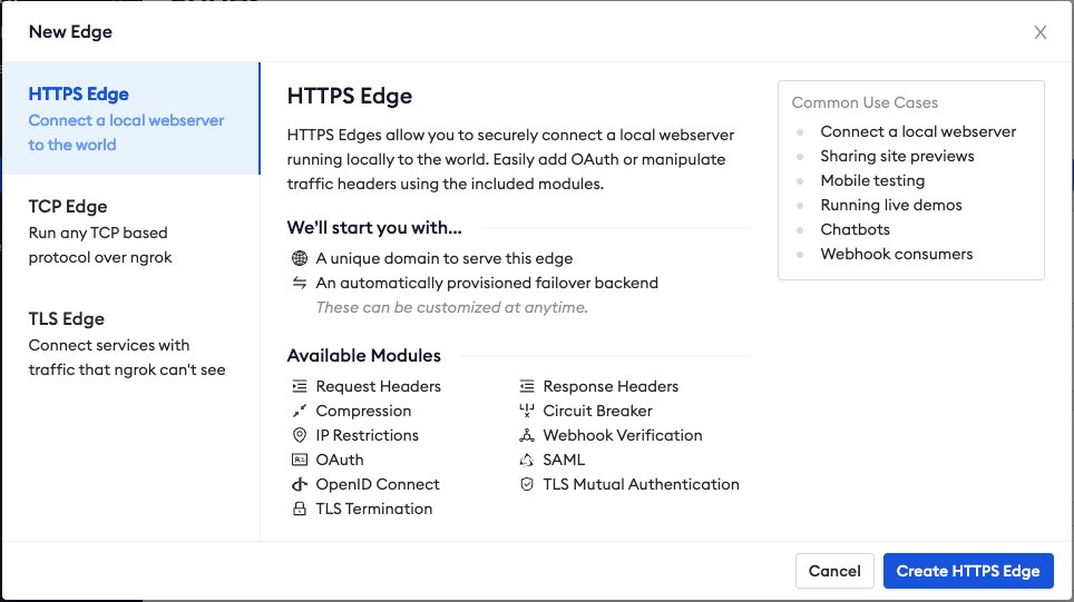 ngrok Cloud Edges are modules that allow you to secure, protect, or manipulate the traffic going to your service. You can configure OAuth, restrict inbound traffic by IP range, and set up webhook verification, just to name a few. Their true value comes from pre-configuring a selection of modules and then starting a tunnel with that same configuration every time.